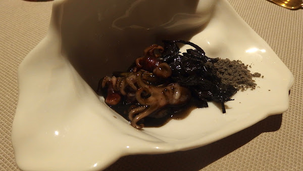Otro platazo son estos pulpitos a la brasa de encinas en su tinta con oreja de ibérico, trompetillas y ceniza de boletus.