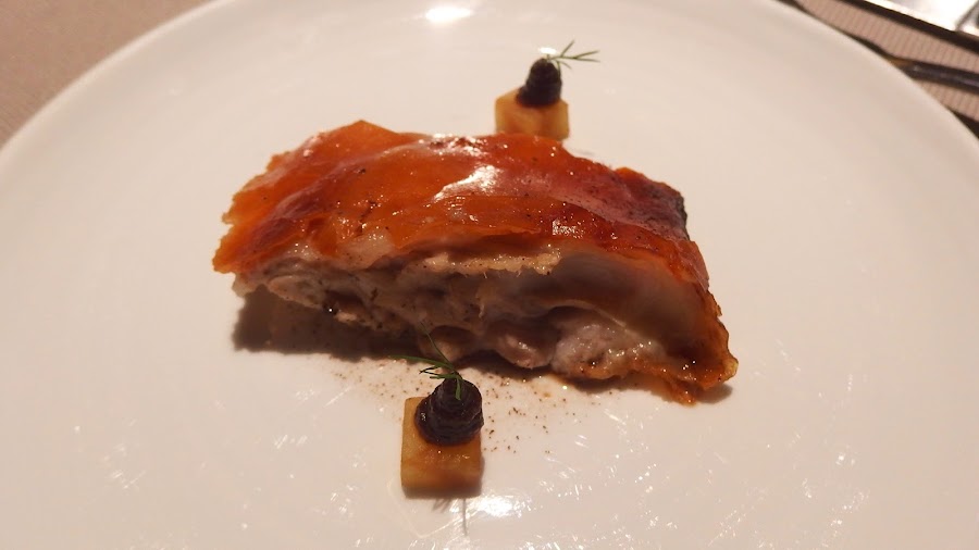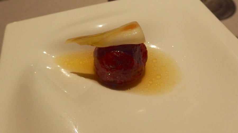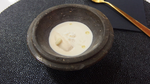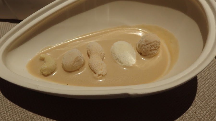 Según nos cuenta uno de los miembros del equipo de cocina, este es el resultado de un trabajo de investigación que están realizando con los frutos secos, que descomponen en diferentes texturas, su aceite, su leche, etc. y con ellas realizan algunas elaboraciones. Me pareció perfecta esta mezcla de texturas del piñón.