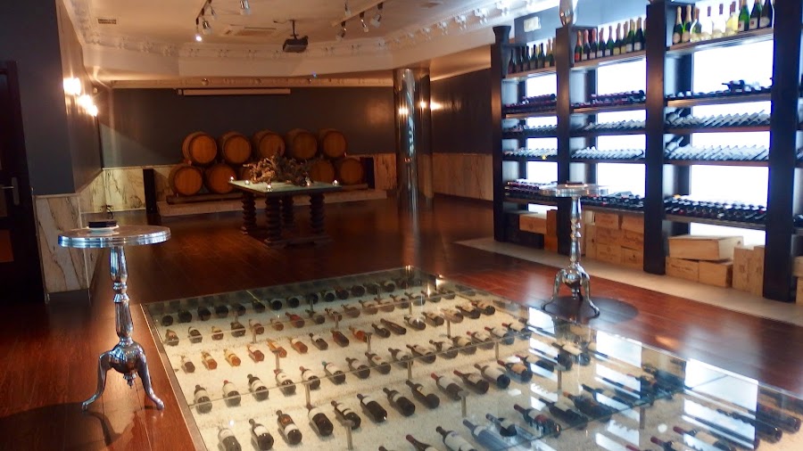 La experiencia comienza en la bodega, donde se disfruta de un cocktail acompañado de unos snacks en una mesa alta.