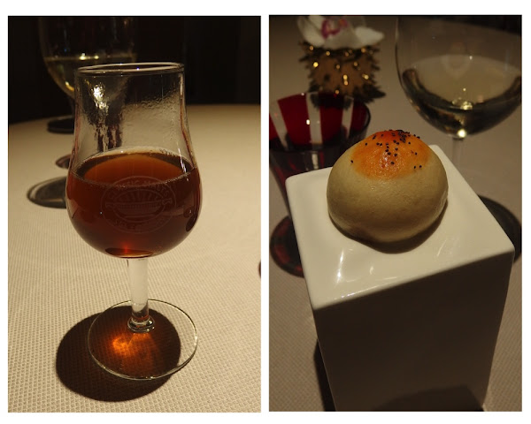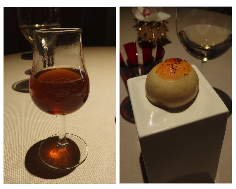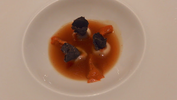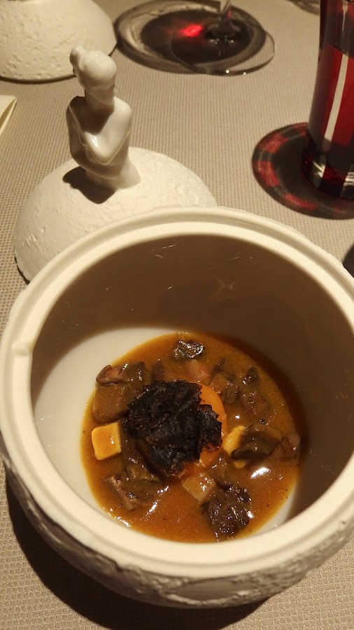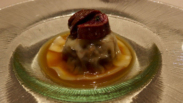 El plato se divide en dos partes, una primera en la que realizan un consomé de armañac y setas en nuestra propia mesa, de sabor intenso. Después el plato se completa con un bollito al vapor relleno de un delicioso y jugoso guiso.