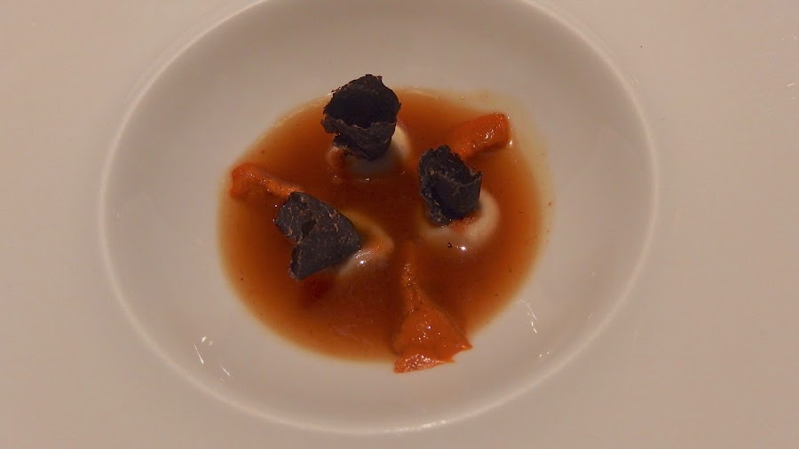 El caldo denso del guiso de callos con un sabor muy potente que acompaña perfectamente al sabor de los erizos de mar, las pochas y la trufa. Delicioso plato.