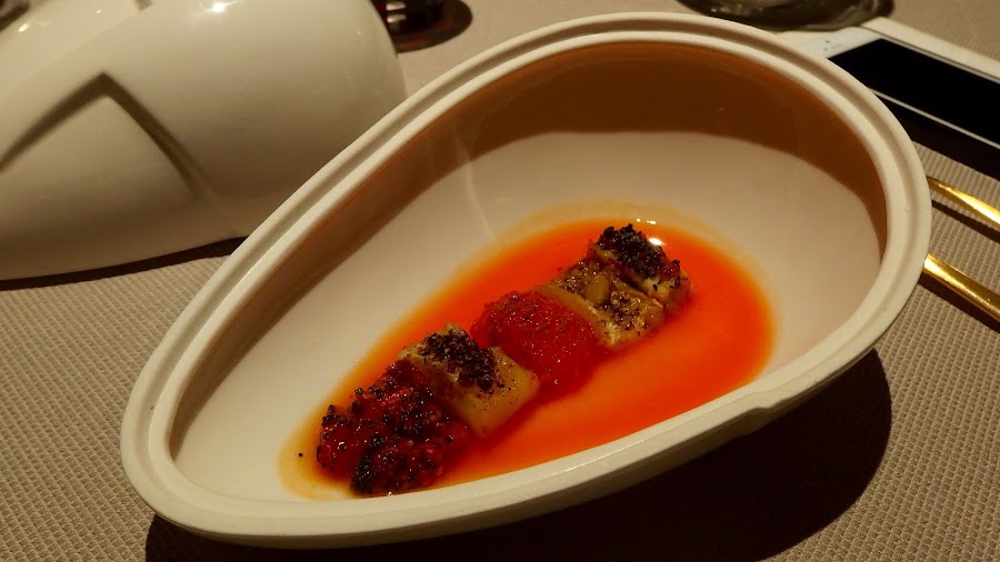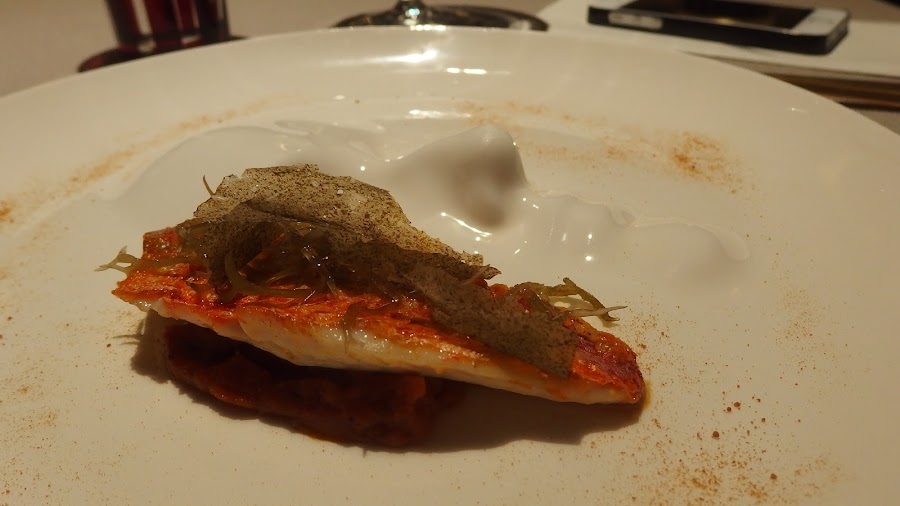 Comenzamos con los platos que incorporan pescados con el salmonete de roca a la brasa sobre su jugo con jengibre, wasabi y guiso de tomate y tamarillo.