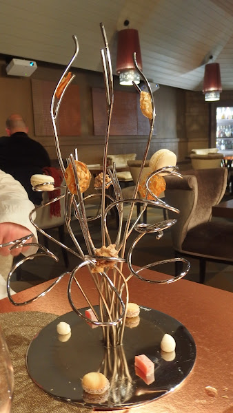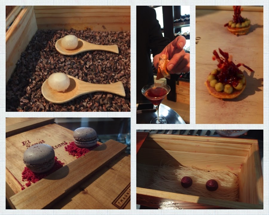 Los snacks son un homenaje al mundo del vino, todos ellos realizados con diferentes uvas. Bocados llenos de sabor y texturas. Uva ácida Sauvignion Blanc, macarrón de Merlot con torta de queso, doriyaki de níscalo y vinesenti con embutido de toro ibérico, bocado aireado de polifenol con remolacha acidulada y corte helado de Pedro Ximenez.