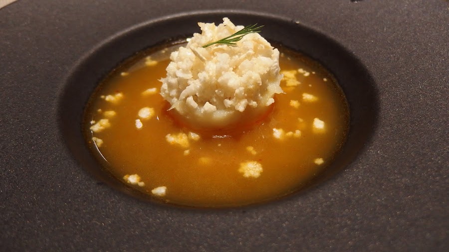 Caldo delicioso acompañado por una brandada de bacalao de un sabor suave y cremosa textura que se contrasta con el crujiente del cuscús de coliflor.