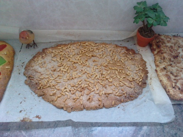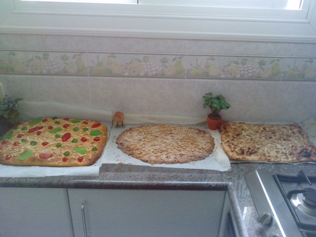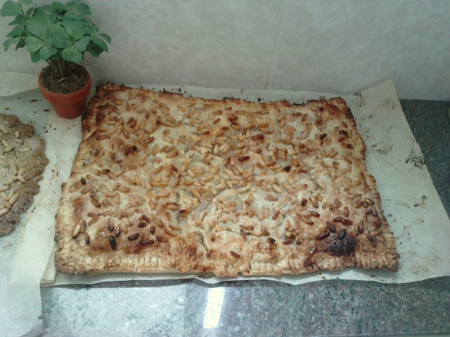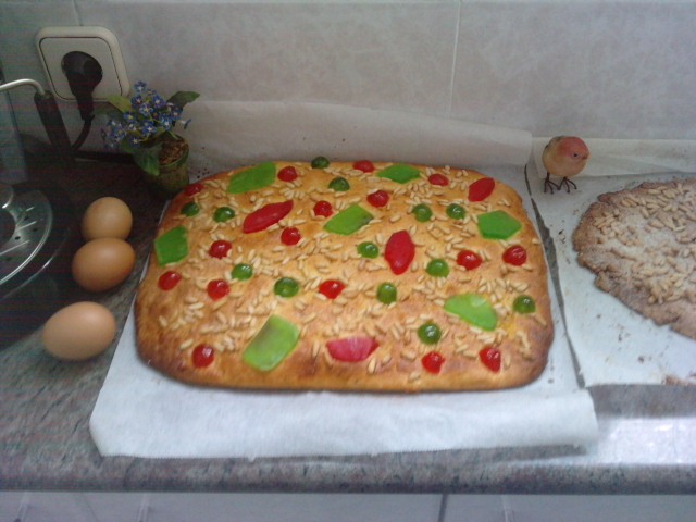 Estiraremos la masa con un rodillo hasta que tenga el grosor de 1 cm. aprox.,La colocamos en una fuente de hornear y pintaremos la superficie con la yema de huevo batida con unas gotas de agua, espolvoreamos de azúcar,ponemos las frutas confitadas y los piñones. Entramos al horno a 180º unos 20 m. pinchar con un ganchillo o algo fino y similar para ver si está cocida.