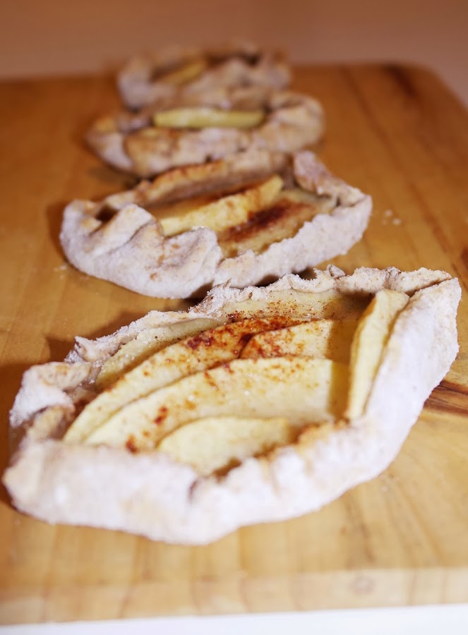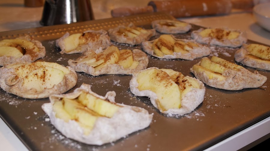 Una vez la masa este lista, poner a precalentar el horno a 250o. Mientras va calentándose el horno, podemos ir preparando la manzana cortada en medias lunas. A continuación coger pequeñas bolas de masa y aplanarlas con las manos o el rodillo hasta hacer una base de una pequeña tartaleta. Poner un par de trozos de manzana y cerrar el borde de las tartaletas. Ir disponiéndolas en una bandeja para el horno, cuando este llena, verter una poco de aceite por encima, espolvorear con canela y un poco de miel o azúcar (blanco o moreno, a vuestro gusto).