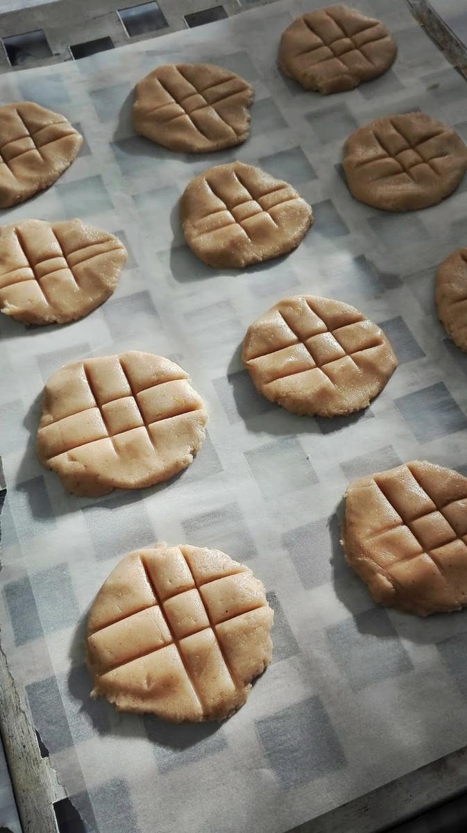 Cogemos porciones de masa (algo mas grande que el tamaño de una albóndiga), redondeamos entre las manos, aplastamos y las vamos colocando sobre la bandeja cubierta con papel de horno.