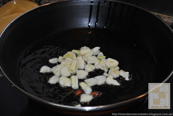 Ponemos una sartén con un poco de aceite y añadimos los ajos laminados y un par de guindillas pequeñas, es cuestión de gusto.