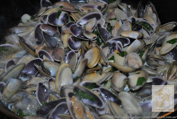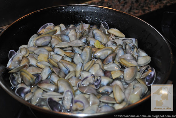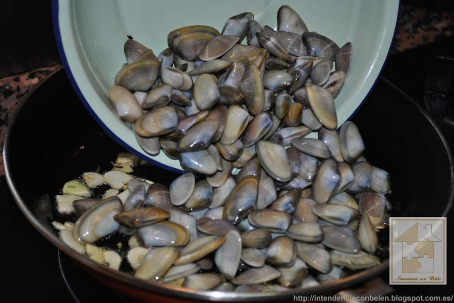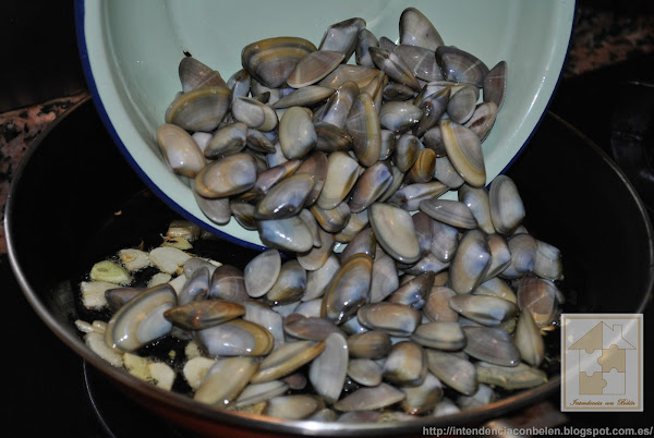 Cuando el ajo está tierno, añadimos las coquinas y tapamos.