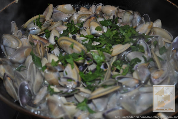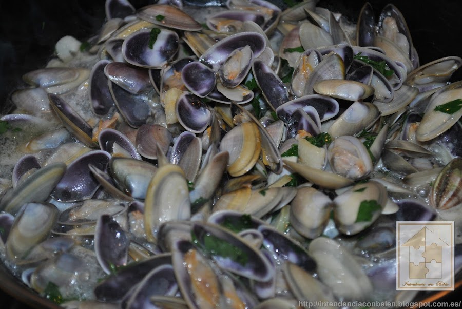 En 2-3 minutos veremos como se abren las coquinas, y ahí es cuando añadimos el perejil picado y retiramos del fuego. Si las almejas o coquinas que usamos son congeladas, suelo añadirles una copa de vino fino o manzanilla y dejar que el aroma inunde el plato, pero en ésta ocasión no he querido apagar el sabor de las coquinas.