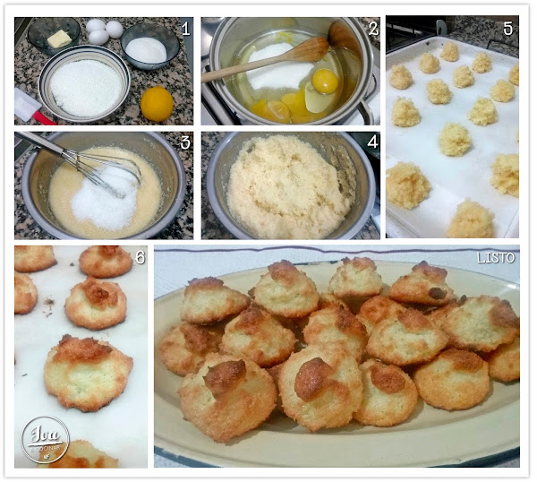 Llevamos a fuego lento una cacerola con los huevos y el azúcar, dejamos que se cocine unos 2 minutos revolviendo continuamente con una cuchara de madera, hasta ver que se forman unas burbujas pero está a punto de coagularse, ahí apagamos el fuego y vertemos esta preparación en un recipiente limpio para cortar su cocción. Agregamos la ralladura de limón, la manteca derretida y mezclamos. Incorporamos de a poco el coco rallado y mezclamos nuevamente hasta formar una pasta unificada.