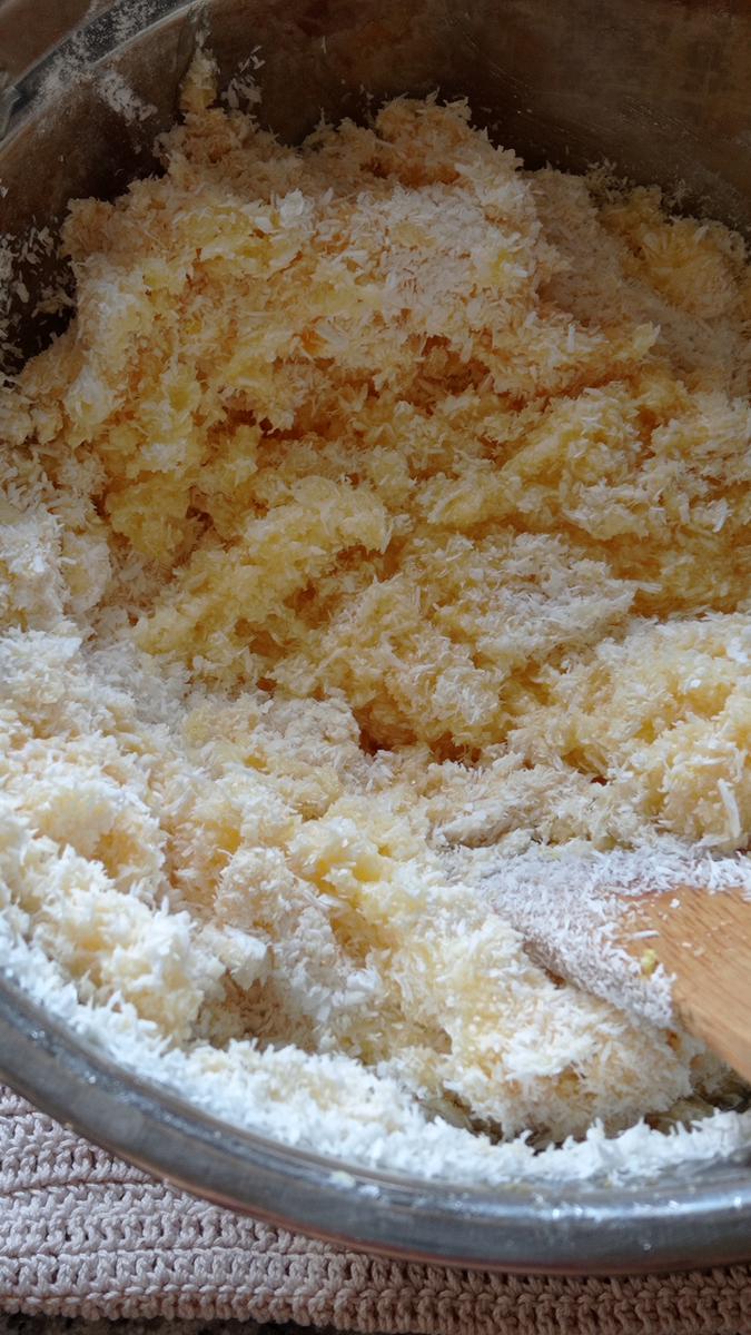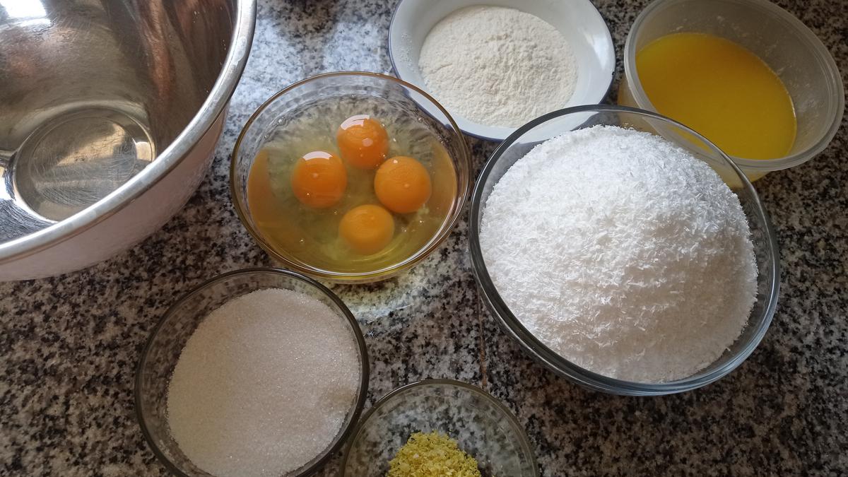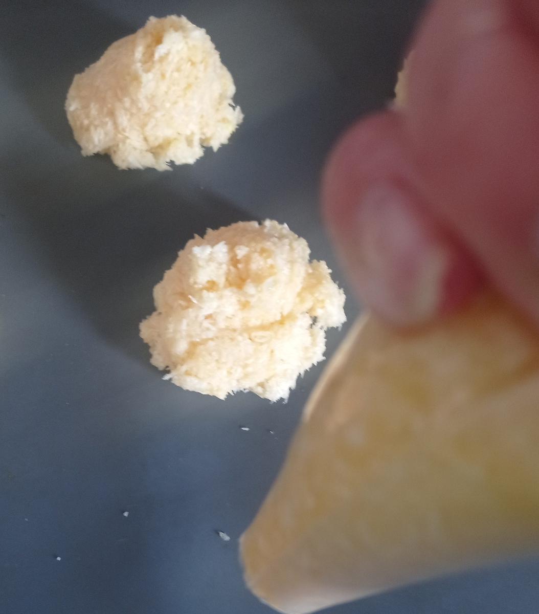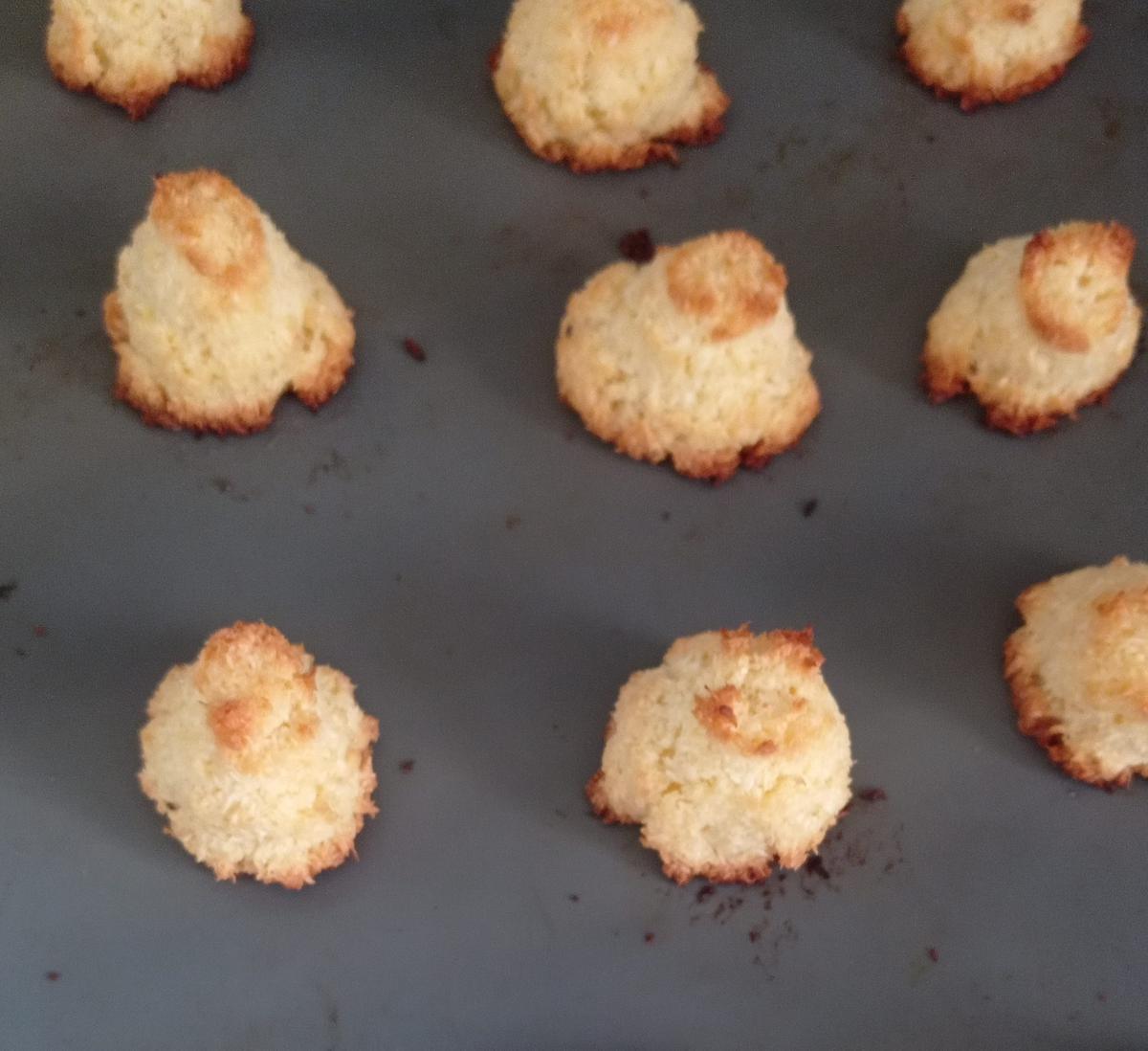 Batir los huevos con el azúcar, agregar la ralladura del limón, el coco, la harina, y la manteca derretidaEnmantecar una fuente para horno o forrada con papel manteca o silicona y hacer pequeños conos