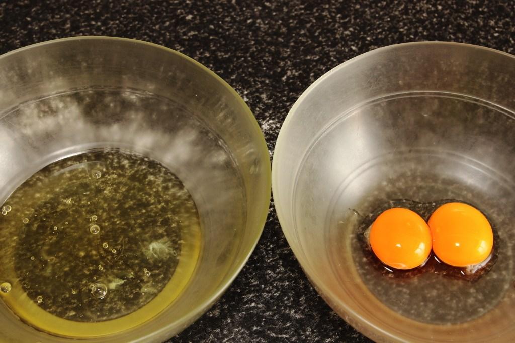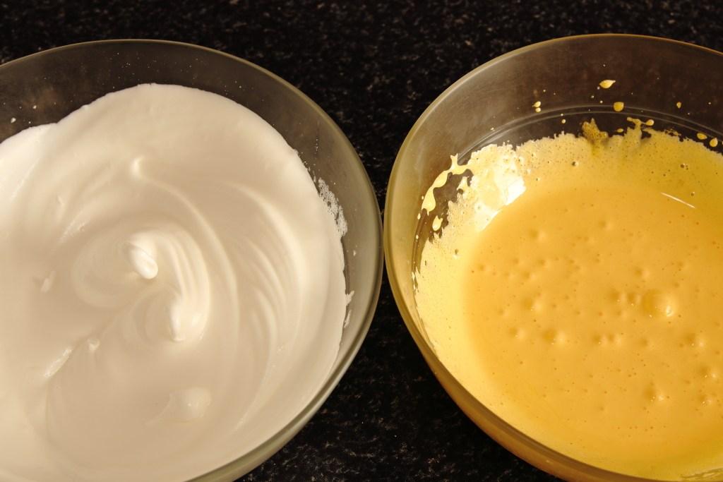 Montamos con las varillas eléctricas las claras, a medio montaje añadimos 50 gr de azúcar y seguimos montando, reservamos. Montamos las yemas con las varillas eléctricas junto con el resto de azúcar (50 gr), hasta que blanqueen.