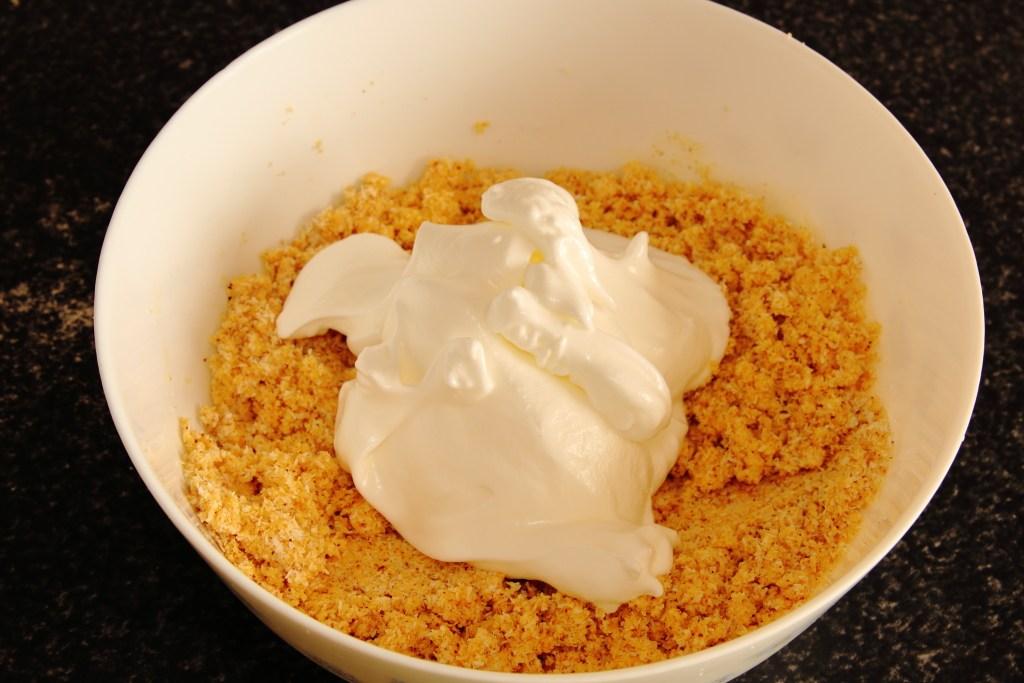 Incorporamos las yemas montadas a la mezcla de coco y avellanas, removemos, que se integren bien. Echamos las claras montadas a la mezcla, removemos con movimientos envolventes.