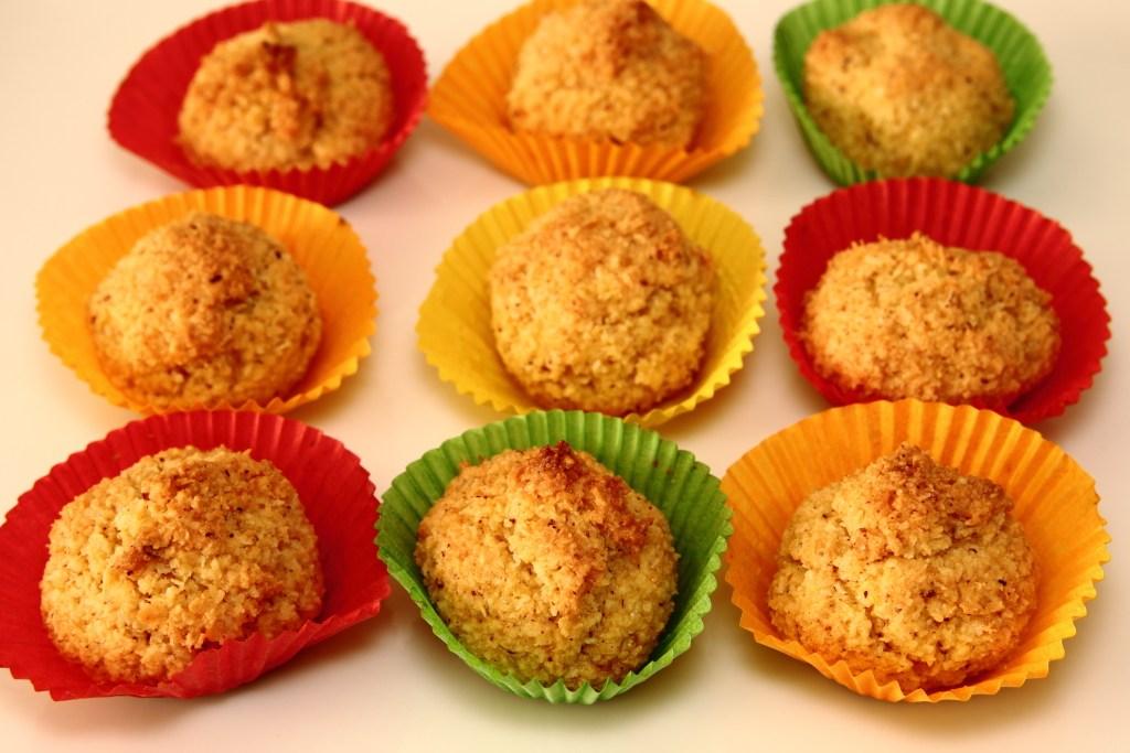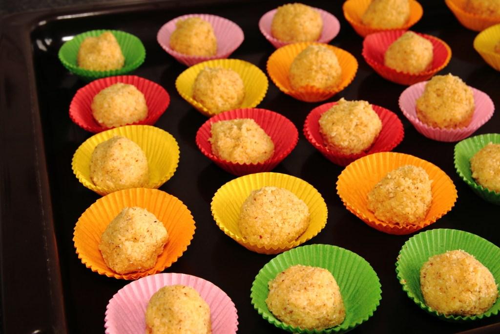 En una bandeja de horno vamos colocando las cápsulas de las magdalenas rellenas con las bolitas de coco.