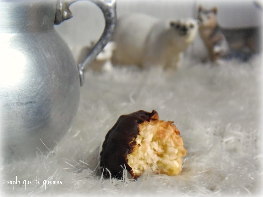 Derretimos el chocolate al baño María y vamos bañando los coquitos, dejamos endurecer el chocolate y listas para comer.