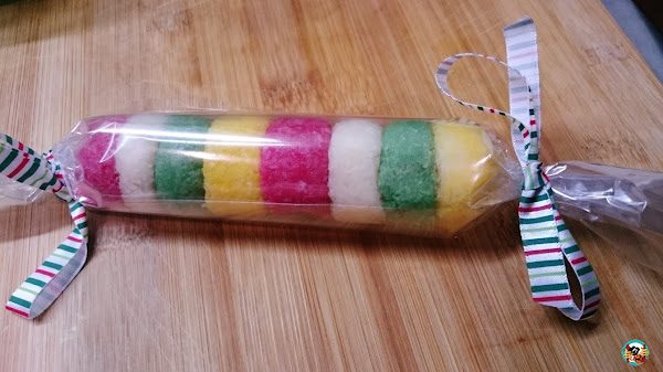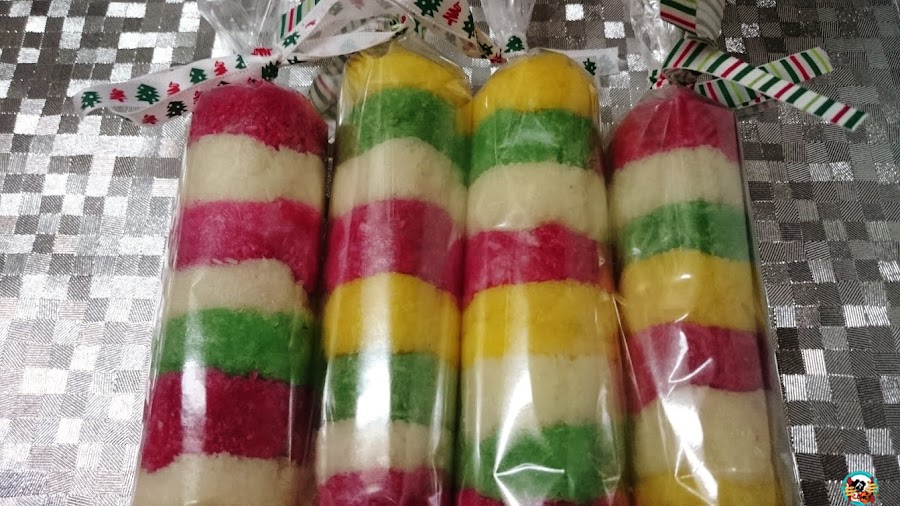 2.-Formamos unas barritas de colores alternado los colores de los coquitos, hasta conseguir un semáforo de colores. Los envolvemos en papel de celofán y cerramos bien con lazos con motivos navideños.