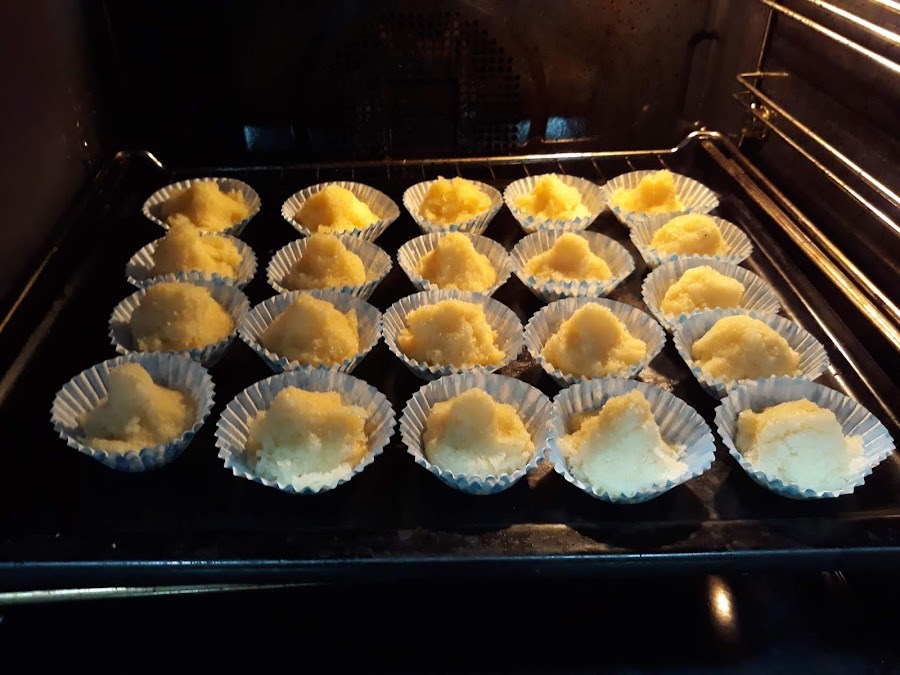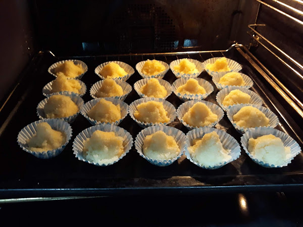 2.- Como no tenía obleas, preparé moldes de magdalenas de papel pequeños y en cada uno de ellos, fue poniendo bolitas de la masa.