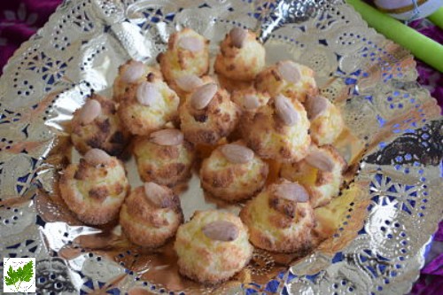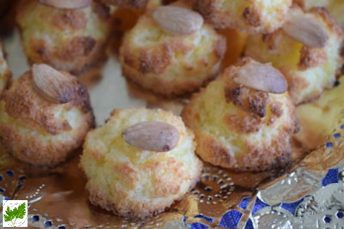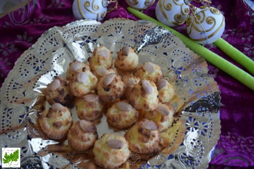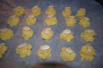 En una bandeja de horno pon papel sulfurizado, engrasa un poco con mantequilla para que no se peguen los coquitos ( yo lo hice con spray antiadherente ). Ve formando los couitos haciendo pequeños montoncitos. Decora con una almendra en cada uno de ellos.