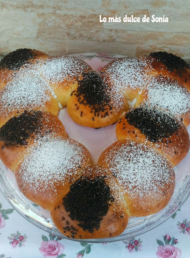 A cada porción le metí una onza y media de chocolate. Pincelamos las piezas con huevo batido con una pizca de sal y dejamos que doblen su volumen en un lugar templado y sin corrientes. Yo lo dejo dentro del horno apagado.
