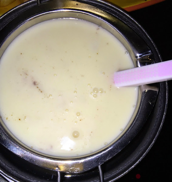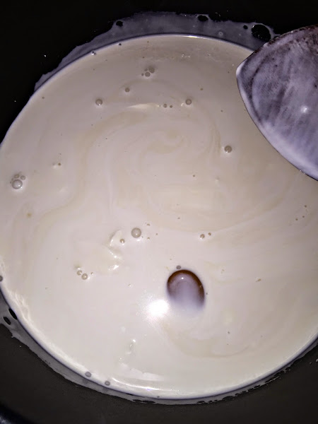 Cuando la nata (crema de leche) del cazo comience a hervir, añadimos el sobre disuelto en la leche fría, y removemos bien para que se incorpore a la nata (crema de leche). Lo removemos sin parar hasta que vuelva a hervir y lo tendremos 1 minuto. Si es necesario bajamos el fuego para que no se pegue ni se queme.