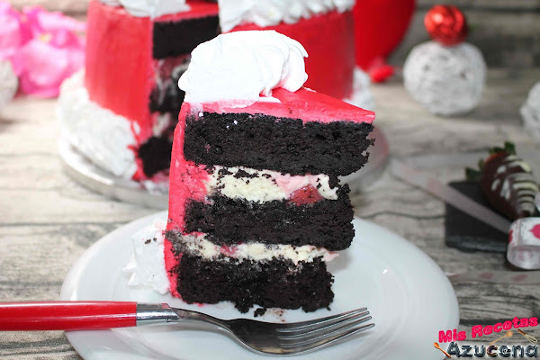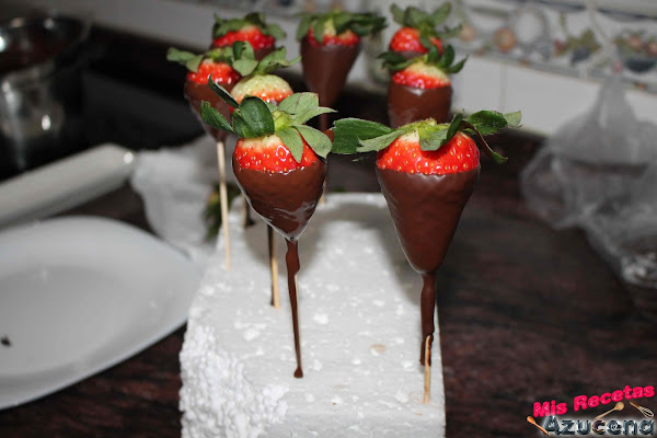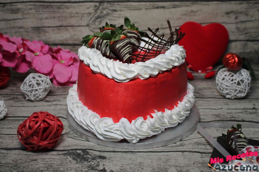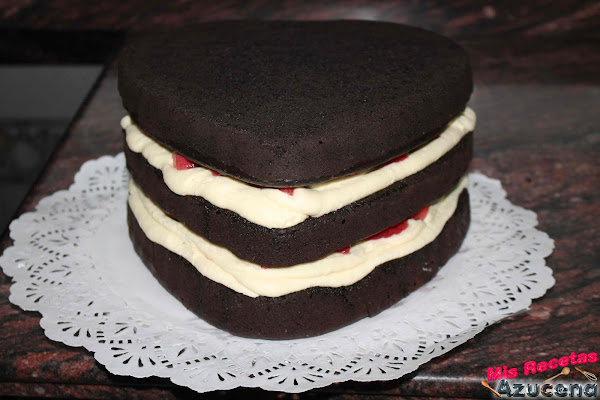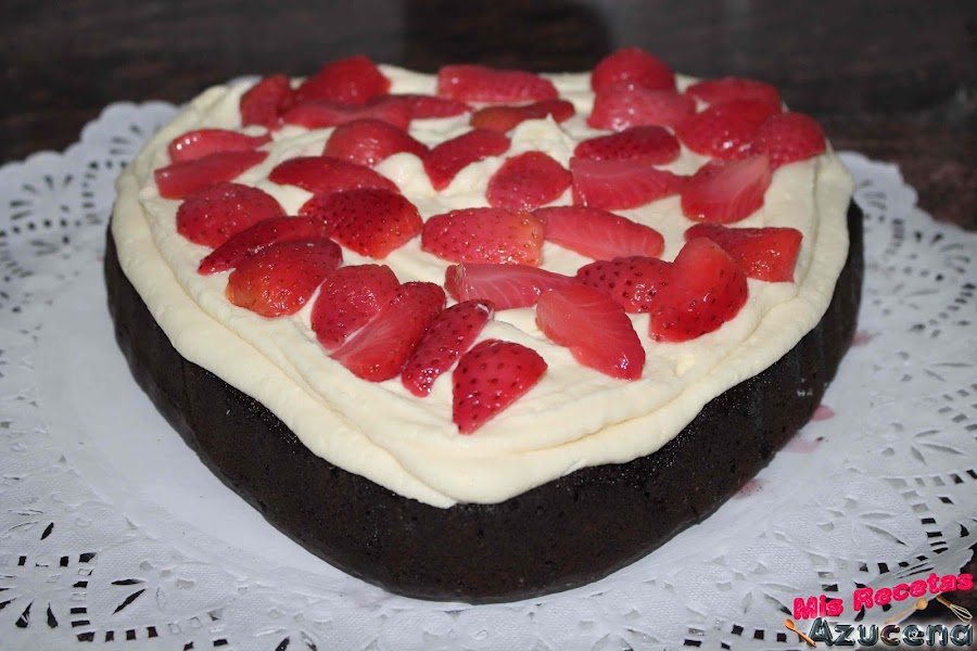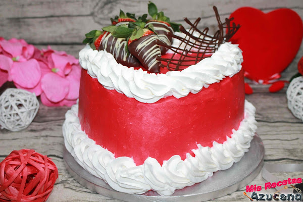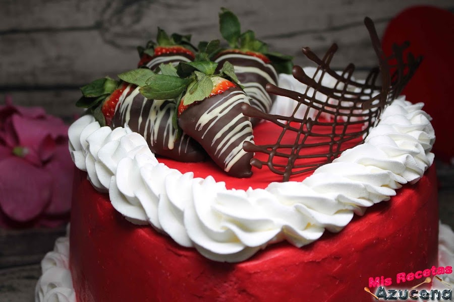 Para adornar. Monta la nata (crema de leche), prepara una manga pastelera con una boquilla del Nº 6 de Wilton, pon la nata (crema de leche) en la parte baja, y encima rodeando la forma del corazón. Después, baña unas fresas en chocolate, las dejas endurecer.