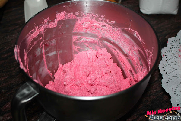 Para seguir con la masa vamos a ir intercalando los ingredientes secos con el suero de mantequilla, el extracto de vainilla, el colorante y el agua. El agua la templaremos en el microondas durante 10 segundos a máxima potencia.