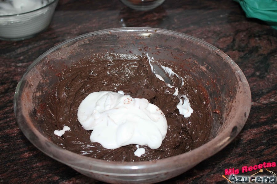 Ahora añadiremos las claras, estas las mezclaremos del mismo modo que la nata (crema de leche), con movimientos envolventes.