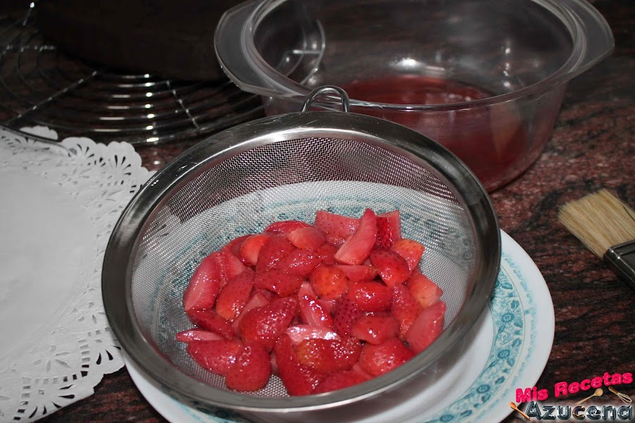 Lo primero que vamos a hacer es preparar un bol no muy grade y un colador para separar las fresas del almíbar.