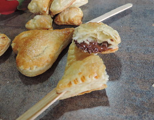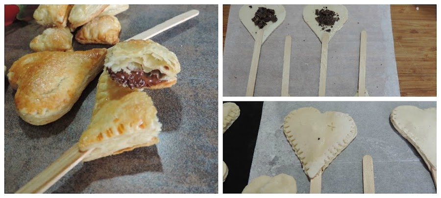 Extendemos la placa de hojaldre sobre papel de hornear o sobre una mesa enharinada.Con un cortador de pastas vamos cortando los corazones.Los colocamos en una bandeja forrada con papel de hornear.Ponemos los palitos de madera y el chocolate troceado en el centro.Pintamos con clara de huevo los bordes y cubrimos con otro corazón.Presionamos con un tenedor para quede bien cerrado.