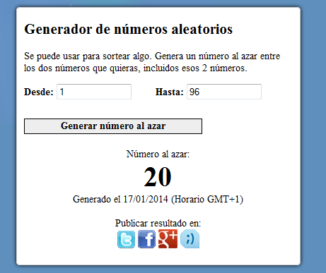 Y ahora a lo importante, el resultado del concurso. He apuntado en una lista a todos los participantes, porque había comentarios duplicados y algunos sólo de felicitación y os habéis apuntado 96 personas, así que he hecho lo del número aleatorio y ha salido el 20.