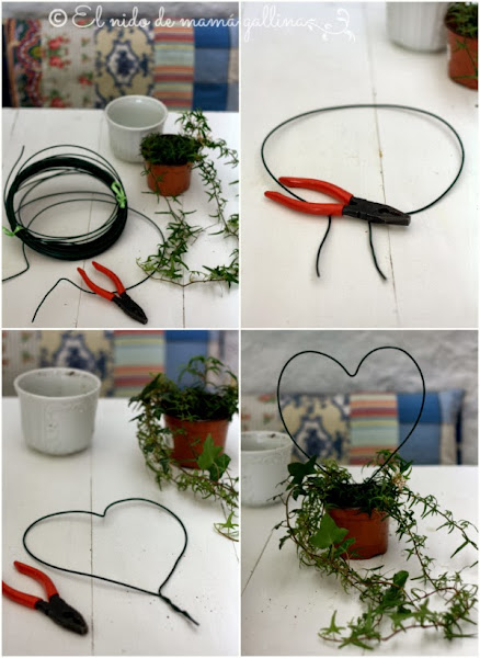 Calculando el ancho de la maceta, hacemos un círculo de alambre dejando dos patitas en las puntas para poder clavarlo en la tierra.