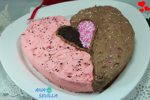 -Cortar el bizcocho en 2 partes y por la mitad, si no tenéis un molde partido. Pincelar con almíbar y rellenar. Tapar, almibarar y cubrir con el resto de la trufa y nata (crema de leche).