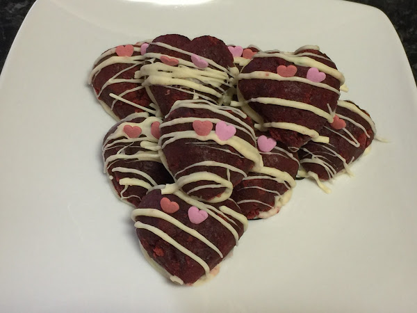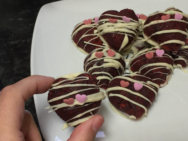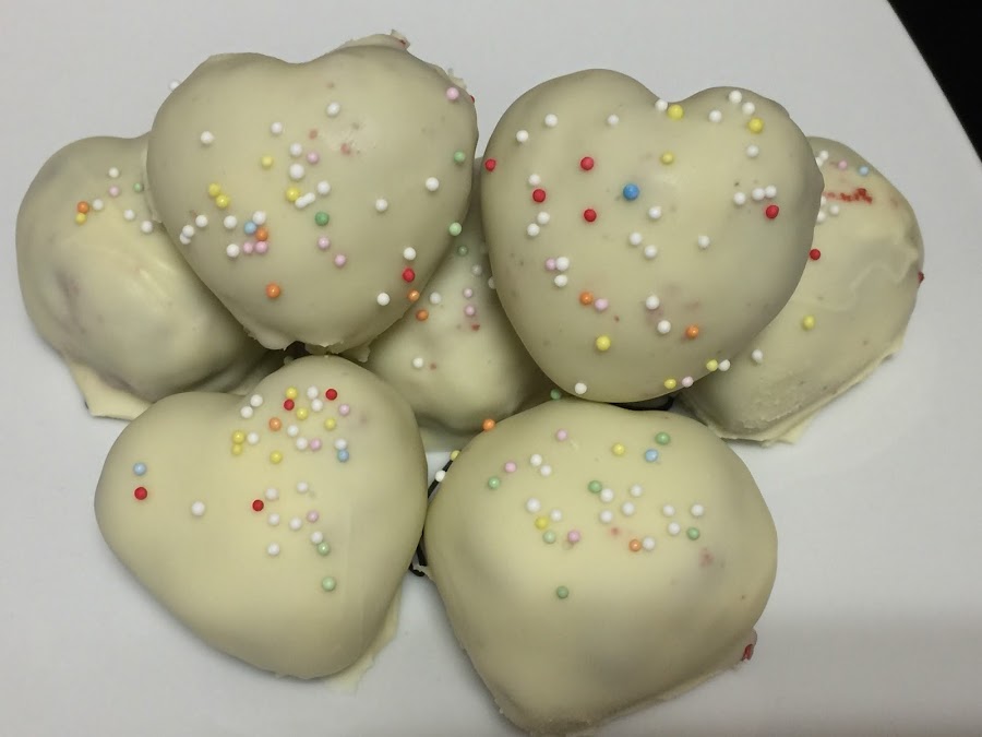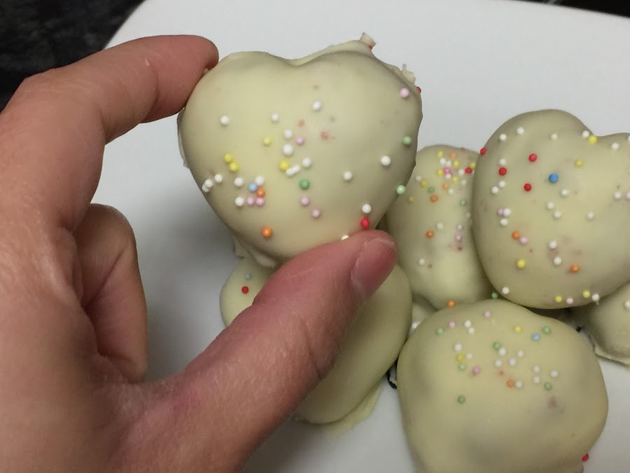 La mitad la he bañado completamente de chocolate y decorado con bolitas de corazones, y con la otra mitad, solo les he puesto chocolate en la base, y con el resto de chocolate, he decorado dibujando unos pequeños trazos por encima y terminando de decorar con corazones de azúcar.