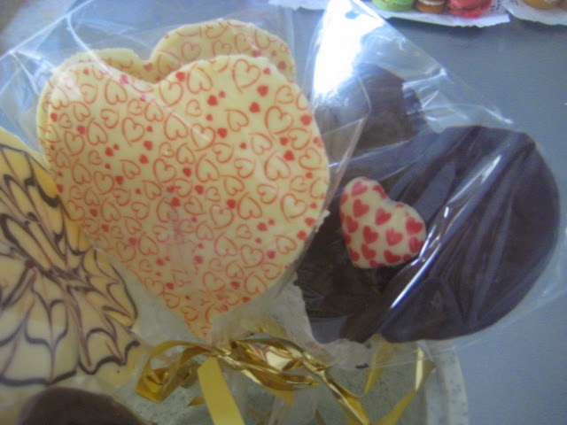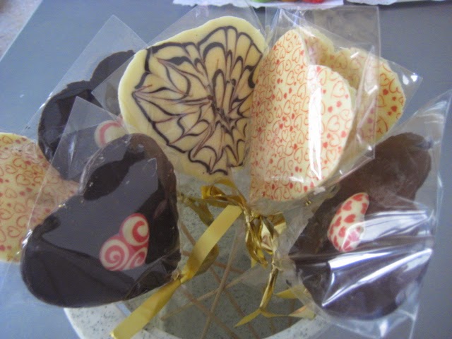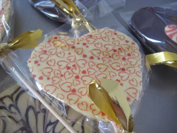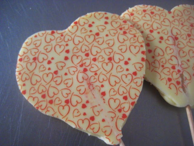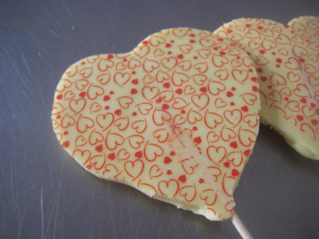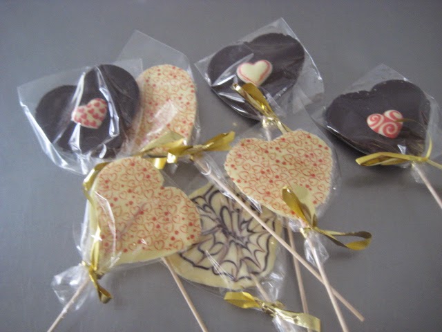 Preparación: Poner las serigrafías para chocolate en una bandeja. Colocar cuidadosamente y, dejando espacio entre ellos, los palitos. Reservar. Fundir la cobertura con leche en el microondas, dejando sin fundir 100 gramos. Cuando esté fundida añadir los 100 gr. restantes y remover hasta que quede todo bien fundido, de eta forma nos queda la cobertura a la temperatura correcta sin necesidad de atemperar el chocolate, que eso ya es más latosito. Una vez obtenida la cobertura extender sobre las serigrafías o transfer para chocolate y dejar unos momentos. Cuando todavía esté el chocolate blandito marcar los corazones y dejar en la nevera. En 20 minutos ya estarán bien solidificados. Retirar del transfer y envolver.