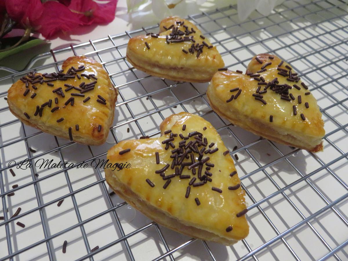 Pincelaremos el caramelo por la superficie del hojaldre y espolvoreamos unos fideos de chocolate.
