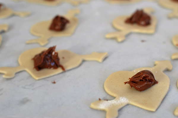 Para empezar tienes que estirar la placa de hojaldre, después sacar los corazones con ayuda del cortador y poner un poquito de nutella en el centro de cada uno ¡cuidado! no pongas demasiado o se saldrá por los lados al hornear.
