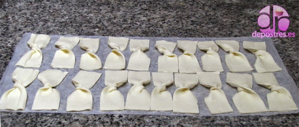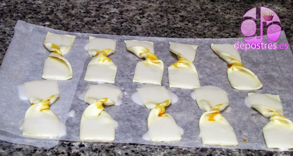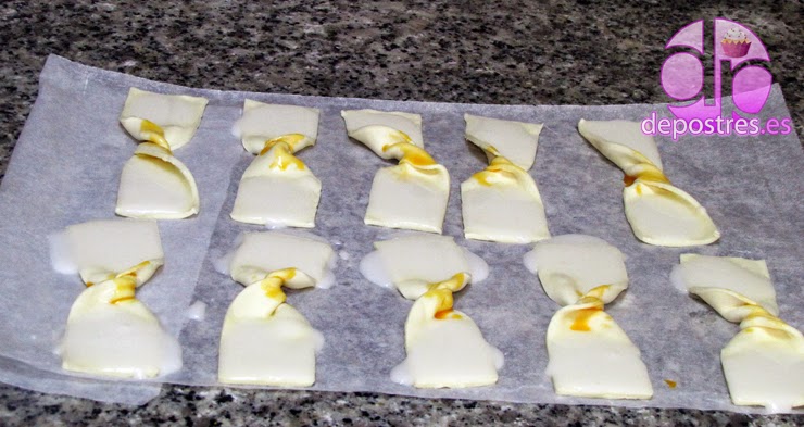 9.- Hornear a 180º, en una bandeja a media altura, unos 12 minutos, hasta que veamos que estén. El tiempo depende de cada horno. Estarán listas cuando veamos que el hojaldre ha subido y la glasa, que es blanquísima, comienza a tomar apenas un poco de color.