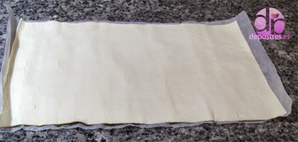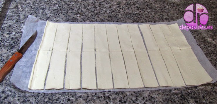 3.- Cortar el hojaldre en tiras de unos 4 o 5 cm. tal y como muestro en la foto, por lo que si el hojaldre es tiene forma rectangular nos viene perfecto.