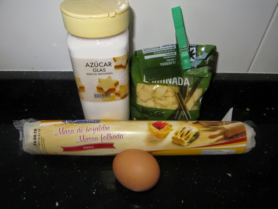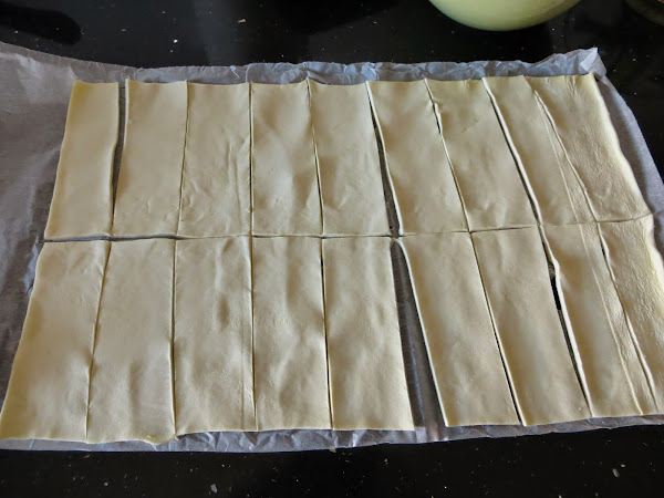 A continuación, abrimos la masa de hojaldre (intentar cuando la compréis que sea rectangular para que no se desperdicie masa), lo dividimos en horizontal en dos partes iguales y cada una de ella la dividimos en tiras verticales para que nos salgan de siete a nueve tiras en cada una de las partes.