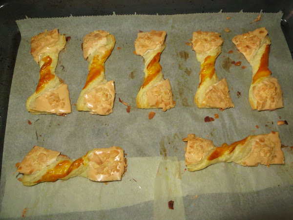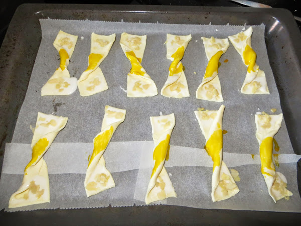 A cada uno de los trozos le damos un par de vueltas en la parte central. Forramos la bandeja de horno con papel de horno y ponemos las corbatas. Precalentamos el horno a 190º y la yema pintamos la parte central de las corbatas.