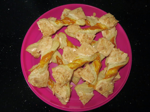 El siguiente paso es poner en cada uno de los extremos de la corbata una cucharada generosa de glasa y la almendra machada por encima de la glasa.