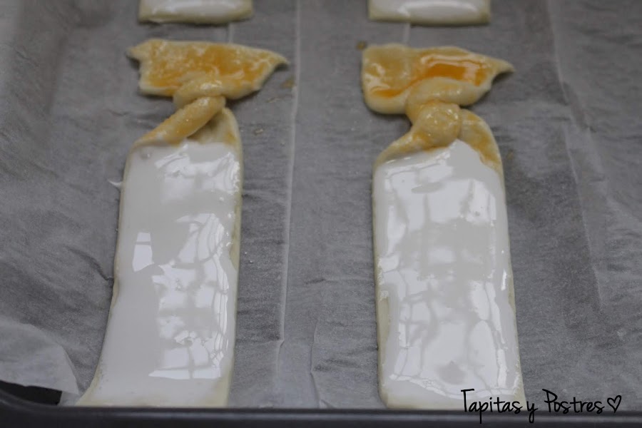 Al hornear la capa de glasa se endurece y se separa ligeramente del hojaldre, señal característica de este postre.
