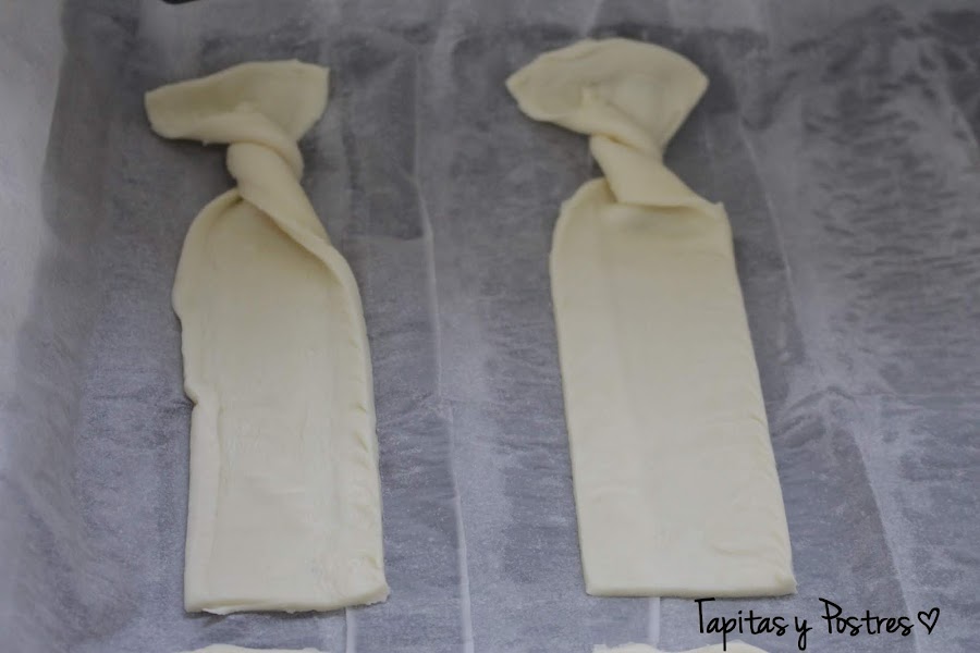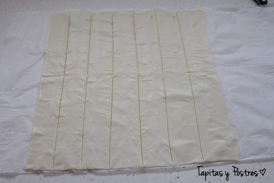 Extendemos el hojaldre y cortamos tiras, nos saldrán unas 14.