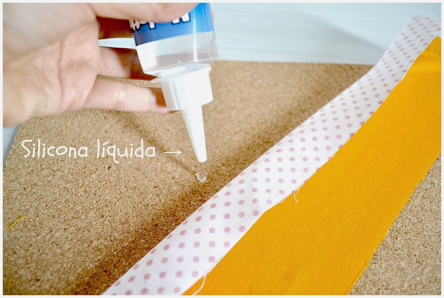 En este paso vamos asegurar mas la tela al corcho esparciendo silicona liquida entre el corcho y las telas que ya hemos colocado, yo luego con los dedos unte la silicona al corcho, luego fije la tela y con las manos aplanaba evitando grumos.