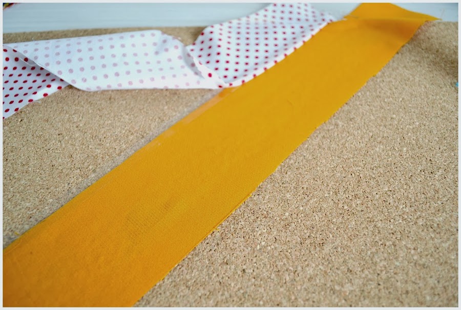 Por ultimo quise que el corcho forrado pareciera un cuadro enmarcado, como no tenia tela para hacerles los bordes, tome cinta de enmascarar de color amarillo (una de mis grandes amigas) y la pegue en los orillos del marco, como es una cinta clara se veía el fondo de la tela y por esto la pase dos veces.