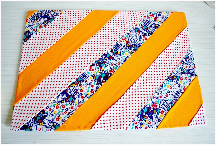 Ahora cuadramos uno de los retazos de tela diagonal como en la mitad del corcho, así fue mas fácil que todas las lineas de tela quedaran simétricas. en uno de los lados de la tela colocamos la cinta pegante doble cara y pegamos al corcho.