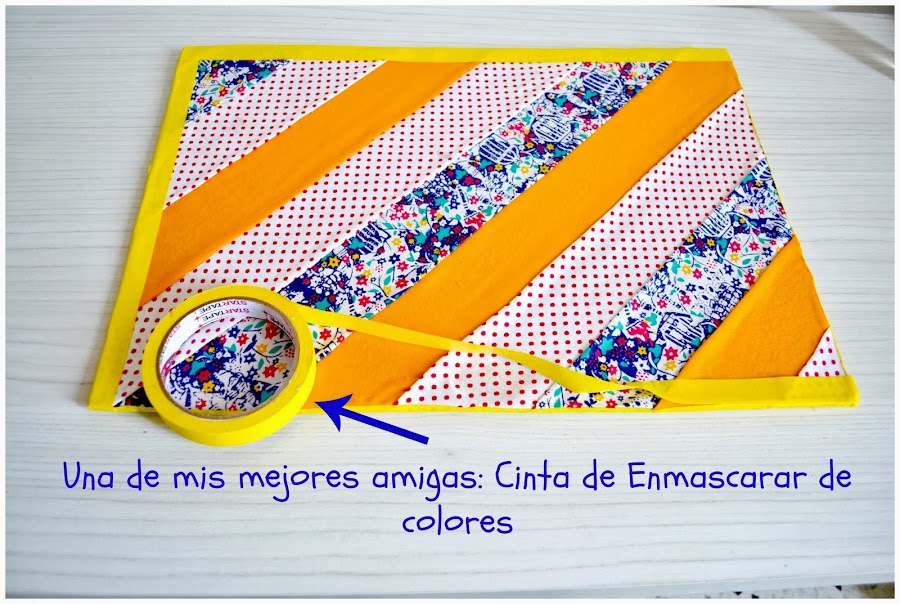 En el extremo del nuevo retazo de tela pegado colocamos la cinta pengante doble cara y asi ir pegando los otros retazos de tela