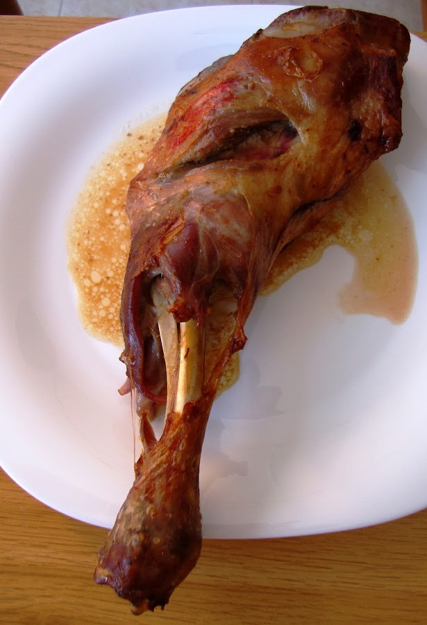 1º En una bandeja de horno poner la pata de cordero y añadir aceite de oliva y sal.