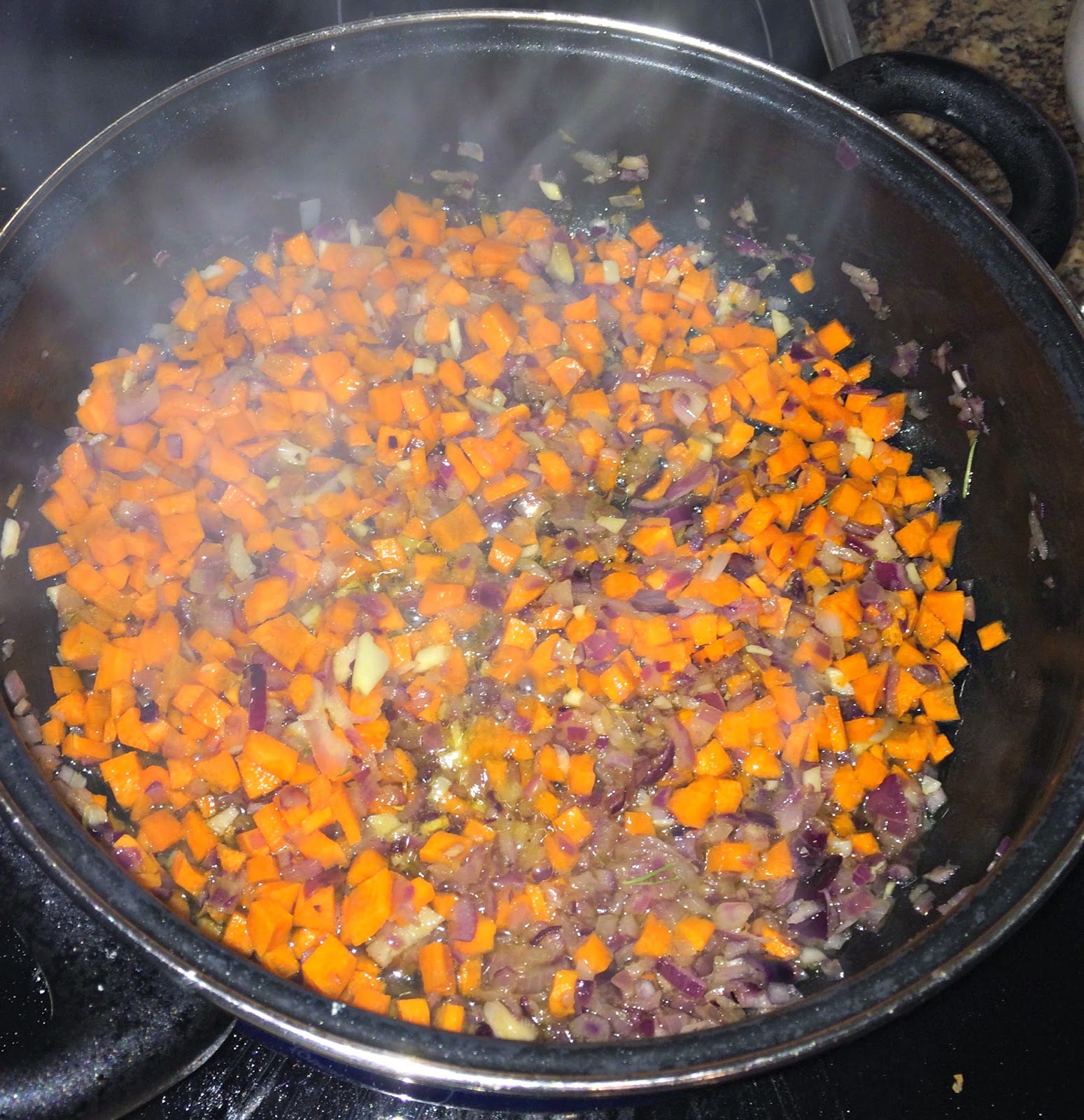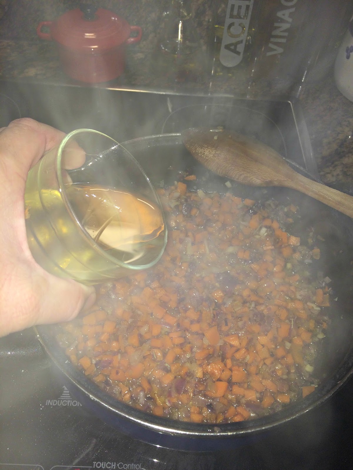 Una vez tengamos todo el cordero dorado, vamos a pochar la cebolla picada muy finamente, en brunoise, cuando esté dorada añadimos el ajo muy picadito y a continuación las zanahorias también en brunoise. Lo rehogamos hasta que se ablanden y lo regamos todo con el vino blanco.